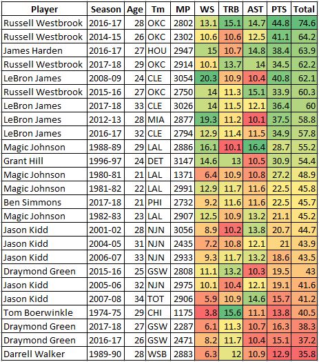 | Player | Season | Age | Tm | MP | WS | TRB | AST | PTS | Total |