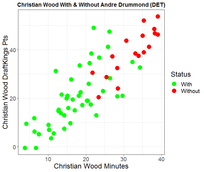 In 17 games without Drummond, Wood averaged 15.02 more minutes (17.25 to 32.26) and increased his DK points per minute by 0.06 (1.16 to 1.22).
